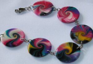 Particularité: pièce unique façonnées entièrement à la main. Composé de 6 perles plates façonnées en pâte polymère, mica et résine, il offre un jeu de couleurs multicolores qui attire le regard et célèbre la créativité.