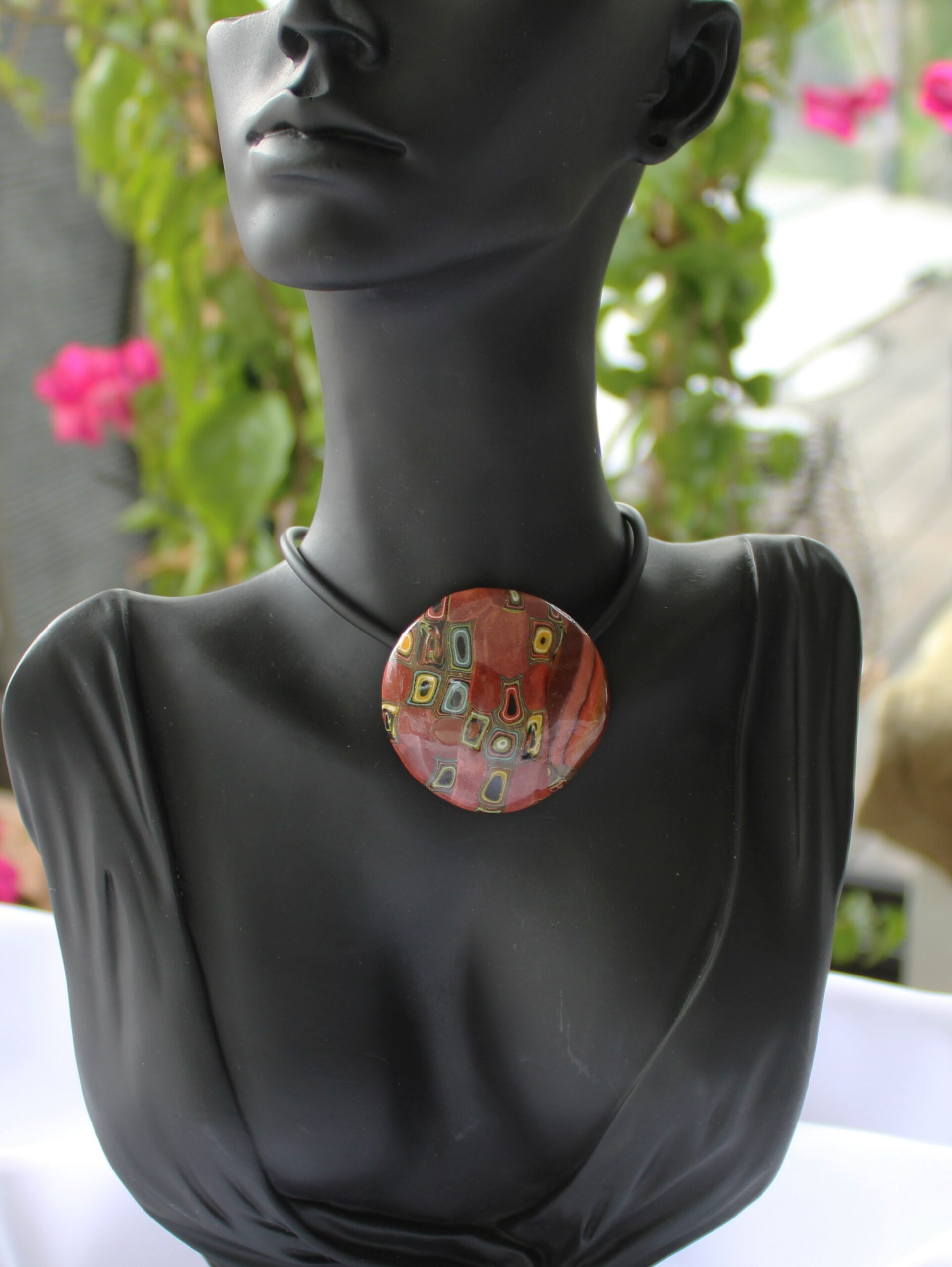 Particularité: Collier fait main en pâte polymère, mica et résine. Pièce unique violet et rose. Pendentif de 4,7 × 2,5 cm sur cordon coton violet de 46,5 cm. Léger (5,97 g), monté sur placage argent. Création artisanale élégante et poétique.